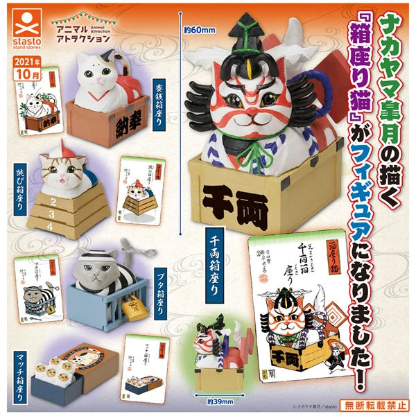 Cette série de gachapon mets les chats en scène dans différentes boîtes typiquement japonaises : Senryo-bako (utilisée à l’époque Edo pour stocker de l’argent), Saisen-bako (boîte à offrandes dans les temples), Tobi-bako (utilisée pour la gymnastique à l’école), Buta-bako (expression familière pour désigner la prison), et Macchi-bako (une boîte d’allumettes) !