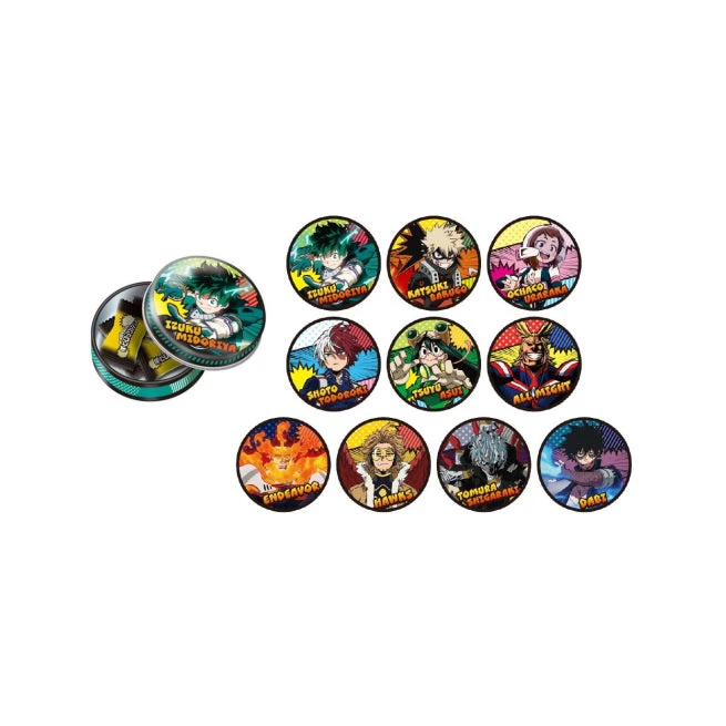 Retrouvez Izuku et vos personnages préférés de My Hero Academia dans cette série de mini boîtes en métal contenant 4 bonbons au raisin.