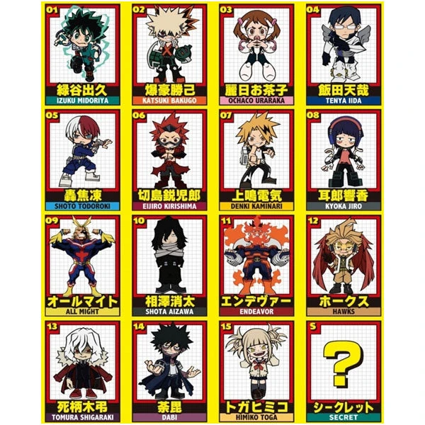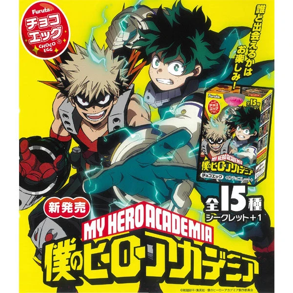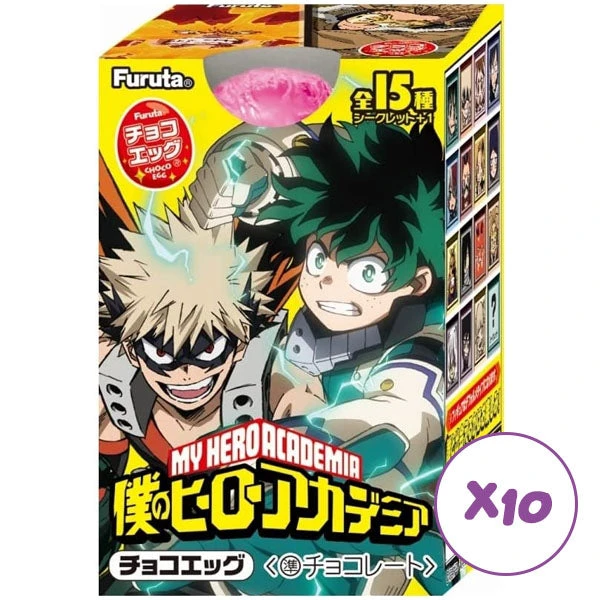 Boite de 10 œufs en chocolat My Hero Academia ! Chaque œuf contient une petite figurine d’un des personnages, au hasard parmi 15 personnages (+1 secret) !
