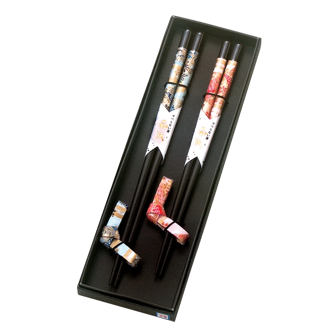 Ensemble de deux magnifiques paires de baguettes aux motifs japonais ! Des petits reposes baguettes sont également inclus dans la boîte !
