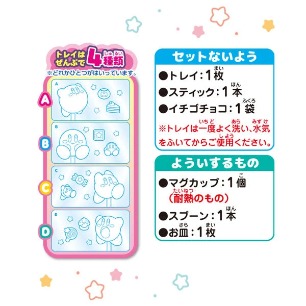 4 moules différents disponibles au hasard, vous permettant de réaliser une sucette ainsi que des petits chocolats Kirby !
