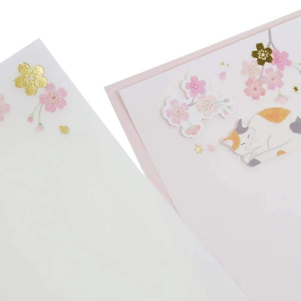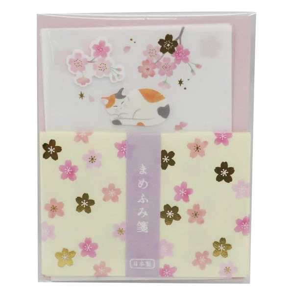 Ce set de papeterie inclus 4 feuilles de papier à lettre traditionnel japonais Mamefumi et 4 enveloppes, avec un design chat et fleurs de cerisier.
