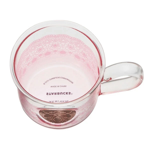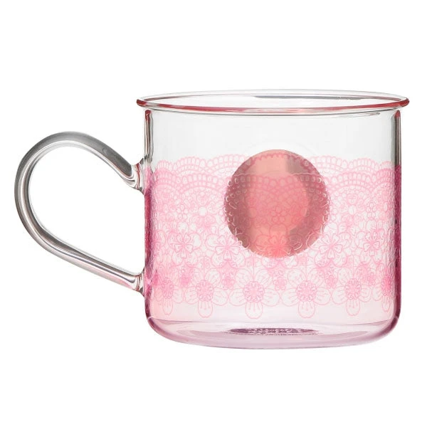 Superbe mug en verre résistant à la chaleur (jusqu’à 120°C), avec un motif pétales de cerisiers en dentelle et un logo sirène couleur or rose placé au centre !