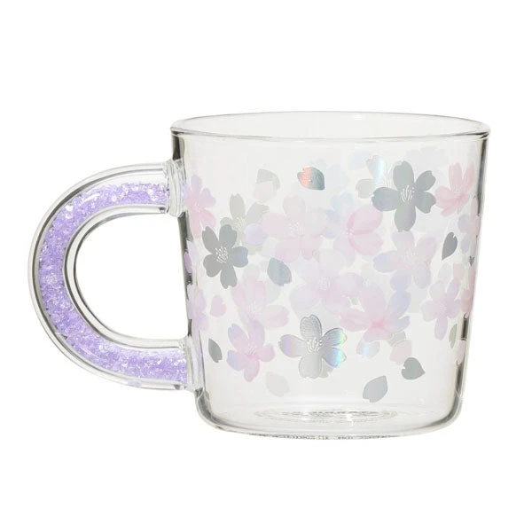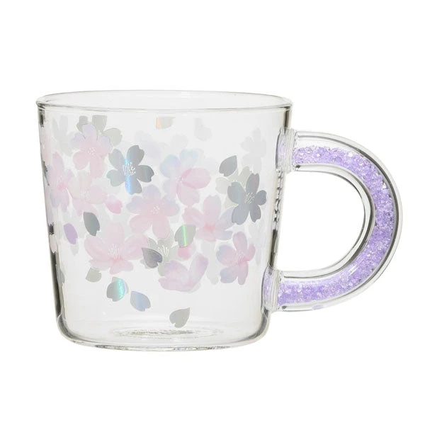 Superbe mug en verre résistant à la chaleur (jusqu’à 120°C), avec un motif pétales de cerisiers et une anse remplie de perles parme !
