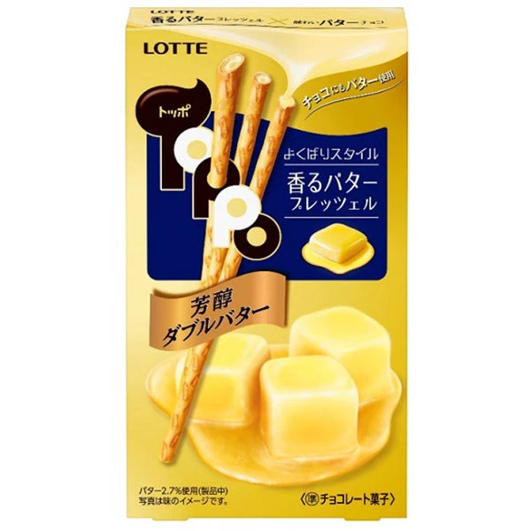 Les Toppo sont des bâtonnets de bretzels fourrés au chocolat fabriqués par Lotte. Cette version « Double Butter » utilise du beurre pour le bâtonnet et pour le fourrage au chocolat !